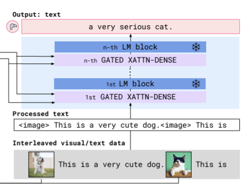 여기서 특징적으로 볼만한 부분은 Gated Cross attention Layer이다. (위 사진에서 GATED XATTN-DENSE로 표기되어 있음.)