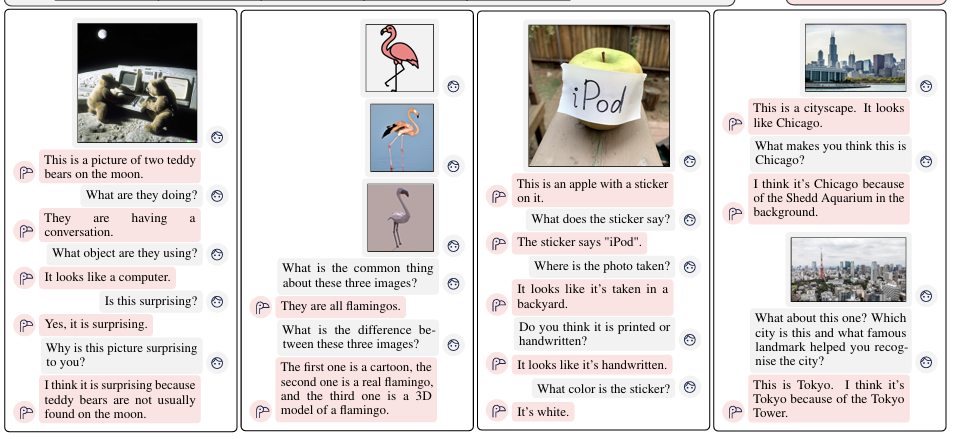 학습 결과, Flamingo는 아래 사진처럼 Multi-image visual dialog와 같은 task도 수행 가능하다. cross-attention을 통해 적은 data로 빠르게 학습할 수 있는 VLM이라는 점, 일부 layer만 learnable하게 만들어 경제적이고 adapting에 유용하다는 점이 Flamingo의 장점이다.