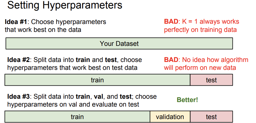 위에서 언급했듯이, K는 보통 3이나 5를 사용하고, distance는 보통 L1,L2 중에 하나를 골라서 사용한다. 그렇다면 내가 사용하고자 하는 데이터에 가장 적합한 K값과 Distance는 무엇일까? 이렇게 알고리즘에서 훈련시켜야 하는 것이 아닌, 우리가 세팅해야 하는 값들을 hyperparameter라고 한다. K, distance 종류 모두 hyperparameter에 해당한다.