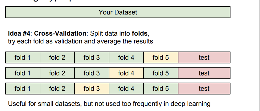 cross validation을 이용해 validation set을 바꿔가며 새로운 데이터에 더 잘 적응하게 하는 방법도 있다. 그러나 K-Nearest Neighbor는 영상처리에는 사용하지 않는다. 속도가 너무 느리고, distance metric 적용하는 것이 영상에 적합하지 않기 때문이다. (차원의 저주 문제도 있다.)