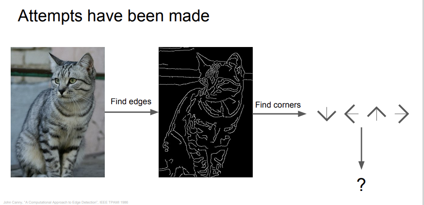 위 사진처럼 edge를 찾아서 고양이를 인식하는 방식이 대표적인 방법이다. 여기서 edge는 물체가 변하는 지점들이다. 갑자기 픽셀 값이 확 바뀐다면 edge로 판별하는 것이다. (여기서 픽셀값이 얼마나 차이나야 edge로 판별할 지는 정하기 나름이다.) 그러나 이 방법은 edge를 다루기가 꽤 힘들다는 문제점이 있다. 지금 소개하는 두번째 방법이 더 나은 방법이다. Data driven approach라는 방법인데, 쉽게 말해 고양이 사진을 미친듯이 많이 준비해서 머신러닝 알고리즘에 넣어 모델을 학습시키는 방법이다. 이런 방법을 사용하면 조금 더 나은 정확도를 가질 수 있을 것이다. 이제 학습시킬 때 사용하는 알고리즘들에 대해 알아보자.