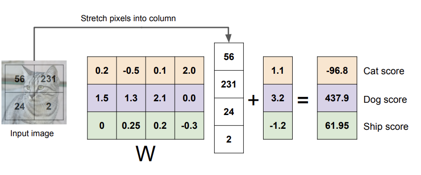 4개의 픽셀과 3개의 클래스만 이용해서 예시를 들어보자면, 픽셀값들 4개를 벡터로 쭉 늘려서 x에 넣고, 행렬 계산을 해서 각 클래스에 대한 점수를 뽑는 것이다. (결과는 신경쓰지 말자)