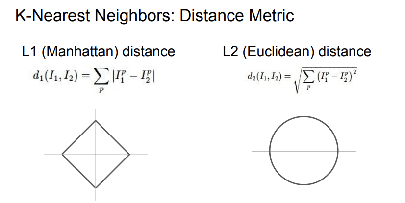 가까운 이웃을 고르는 방식이 두 개가 있는데, L1과 L2 distance이다. 둘 중에 뭐가 더 좋은게 아니라, 데이터의 특성에 따라 적절히 골라서 사용해야 한다.