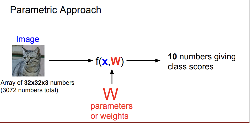 x는 input data, W는 가중치인 weight를 의미한다. 위 사진과 같이 이미지를 어떤 linear classifier f에 넣으면 각 class에 해당하는 점수 10개를 반환한다. 이 10개의 점수 중에 가장 높은 점수를 갖는 클래스가 영상 속의 사물일 가능성이 높은 것이다.