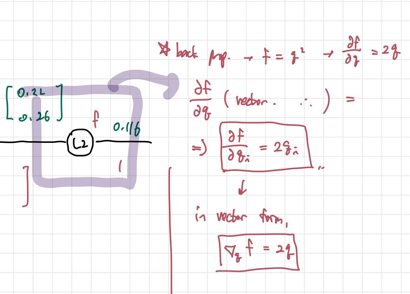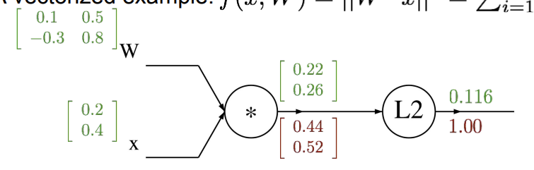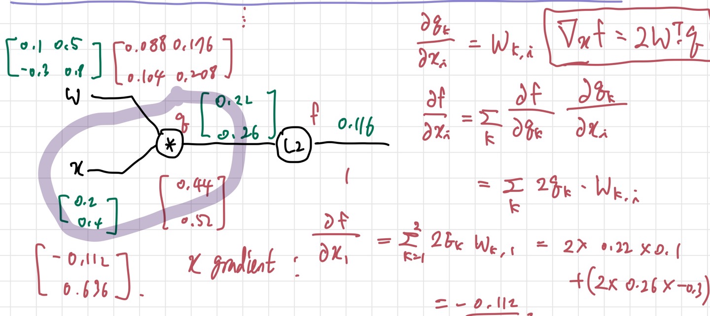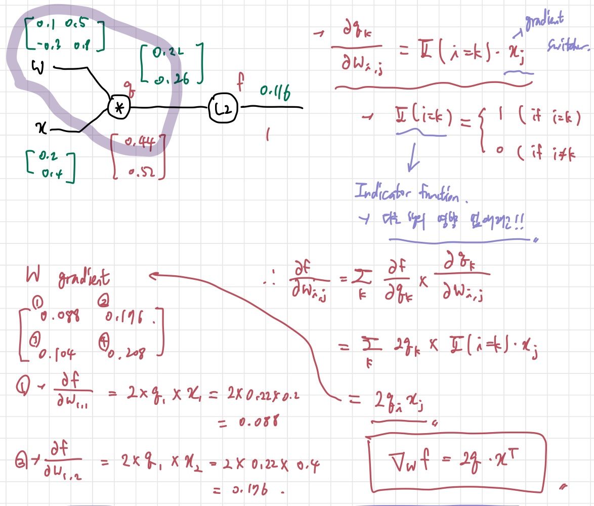 벡터에서 다른 점은, 벡터 안에 여러 개의 원소들이 있으니까, 그 요소들의 미분값을 따로 계산해줘야 한다는 것이다. 이 사진 위의 사진을 보면 는 L2를 사용하기 때문에 벡터의 원소들을 다 제곱해서 더한 형태를 띈다. 이때 벡터의 원소를 각각 분리해서 본다면, 라는 값을 얻게 된다. 는 벡터에서 우리가 어떤 원소를 사용하고 있는지 알려주기 위함이다. 위 과정을 마치면 의 gradient 값을 구할 수 있게 된다. (는 mul gate의 intermediate variable이다.)
