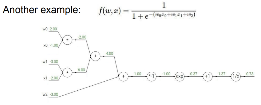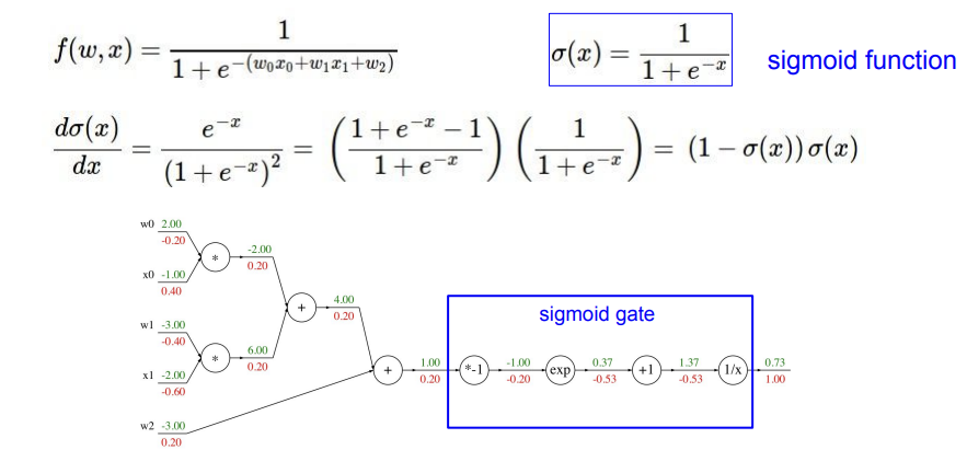 어쨌든 이런 과정들을 반복하다 보면 updated gradient가 구해지게 된다. 그런데 여기서 중요한 지점들이 몇가지 있다. 지금은 computational graph를 모든 연산을 하나의 노드에 배정해 그렸지만, 꼭 그렇게 해야하는 것만은 아니다. local gradient를 구할 수만 있는 식이라면, 여러 노드들을 합쳐서 하나의 노드로 만들어도 된다, 우리가 많이 사용하는 sigmoid function의 형태를 띄고 있으니, sigmoid function으로 하나의 노드를 만들어보자.