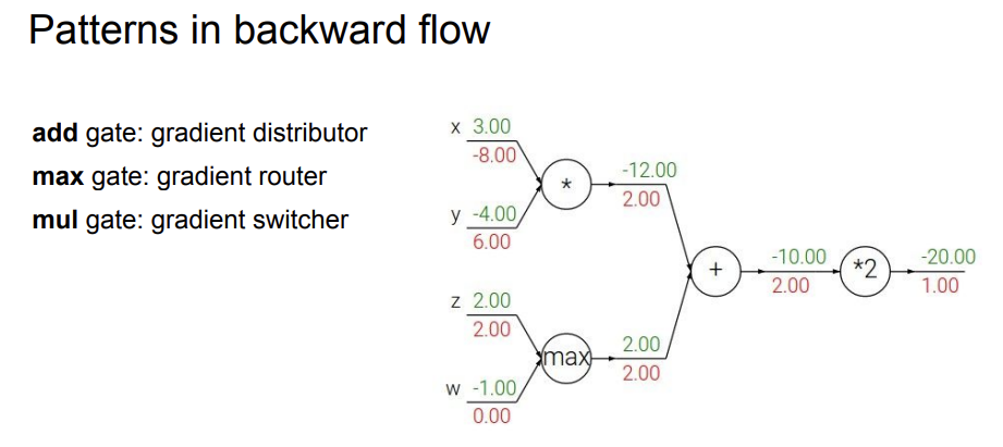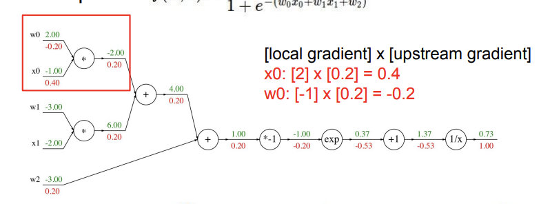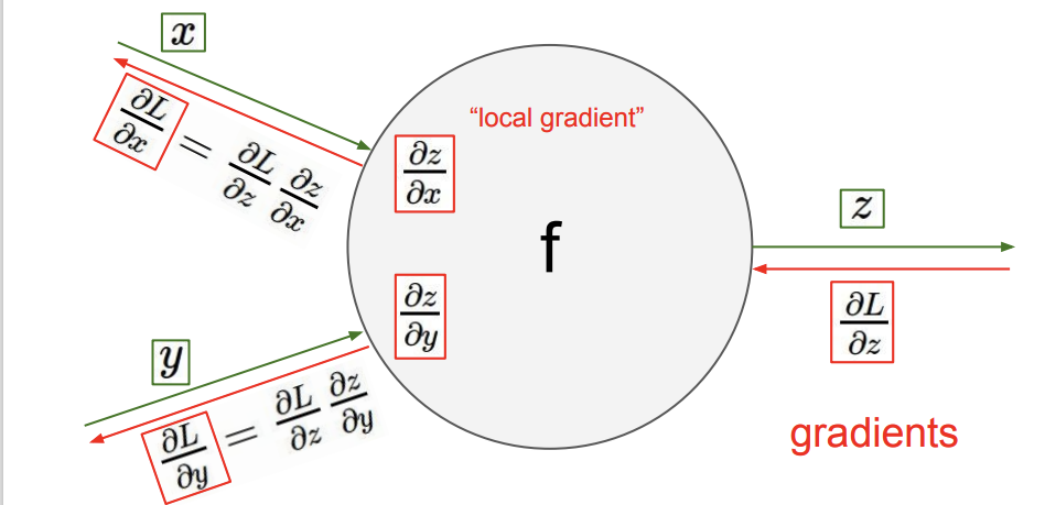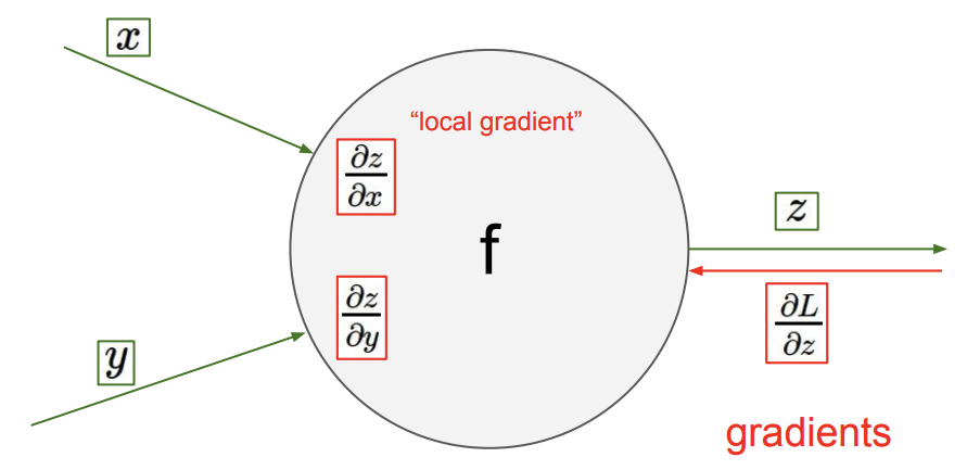 - local gradient: 주어진 값들로 미리 구할 수 있는 gradient를 의미한다. forward pass를 할 때 구해진다.