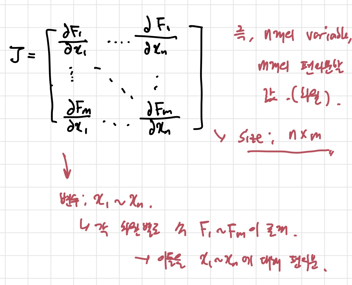 다변수 미적분학을 공부한게 아니라, 이해하는데 애를 먹었다. 간단히 정리하자면, 각 차원에 F라는 식들이 존재할텐데, 이 F는 n개의 변수를 갖는다. 따라서 F를 n개의 변수에 따라 편미분한 값들이 하나의 행에 쭉 나열되는 것이다. 그 다음 행에는 또 다른 input에 대한 편미분 값들이 있는 것이다.