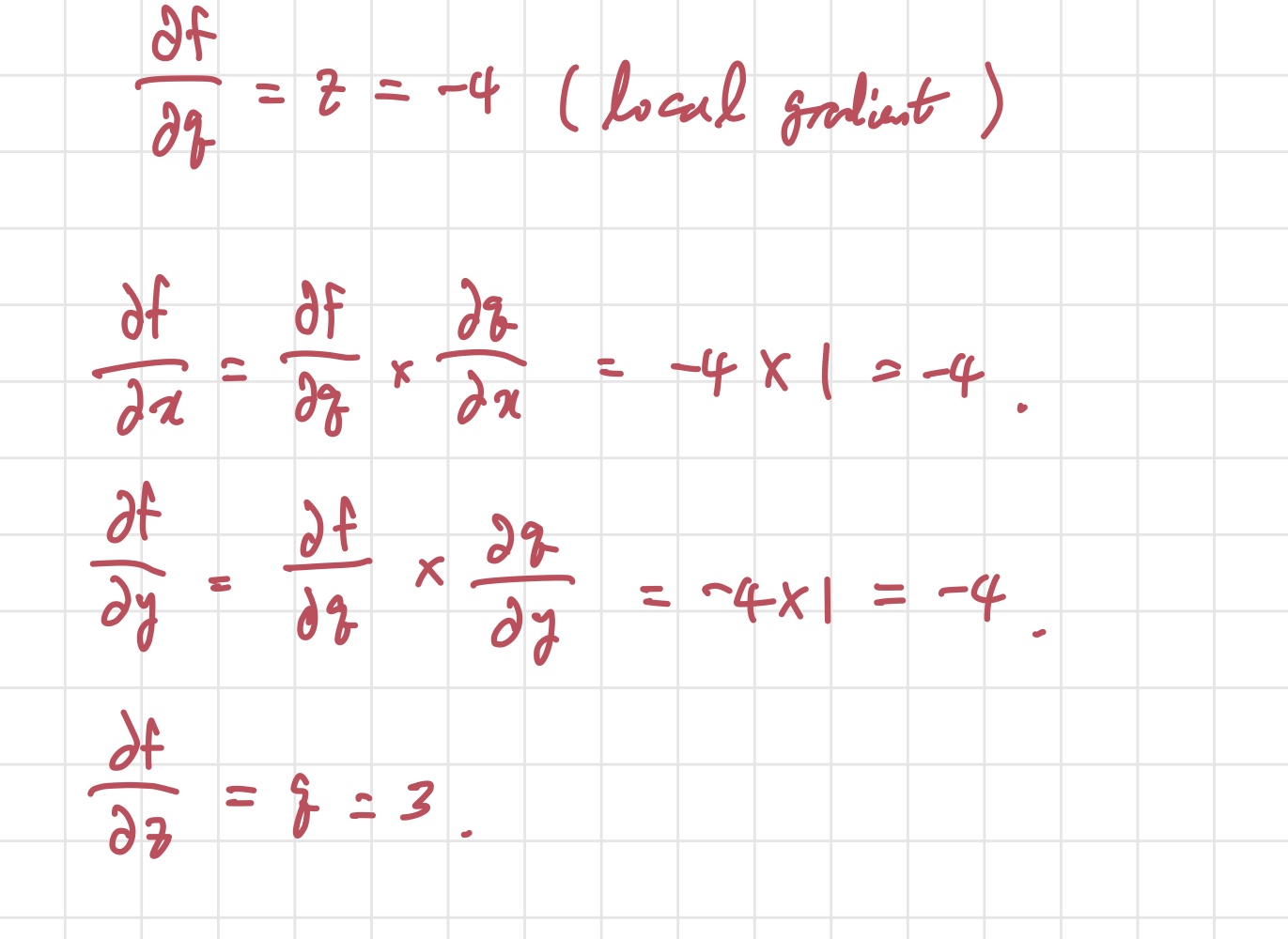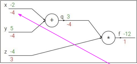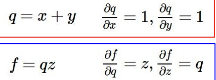 위의 첫 번째 사진이 f에 대한 computational graph이다. 초록색 숫자들은 그냥 예시를 위해 써놓은 이다. (정확히는 값을 정하고, 그들을 이용해 값을 계산한 것이다.) 여기서 등장하는 개념이 편미분인데, 간단히 생각하면 여러 변수를 가진 식 중에 내가 관심 있는 하나의 변수에 대한 미분값에만 집중해서 보는 것이다. 그 변수 이외에는 다 상수 취급하면 된다. 여기서 사용되는 또 다른 개념은 chain rule이다. 편미분 값을 여러개 이용해 원하는 편미분 값을 찾아내는 것이다. 이제 local gradient와 global gradient의 개념만 배우면, gradient 업데이트를 하기 위한 준비는 끝난다.