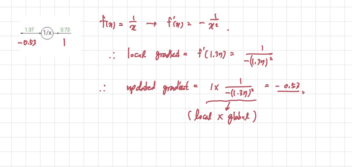 뒤에서 global gradient 가 들어오면, 이를 통해 의 gradient를 업데이트한다. 이 과정을 back propagation이라고 한다. 이걸 계산하는 나름의 공식을 써보자면 updated gradient= local gradient * global gradient 가 된다. 이제 공식도 알았으니, 예시에 적용해보자.