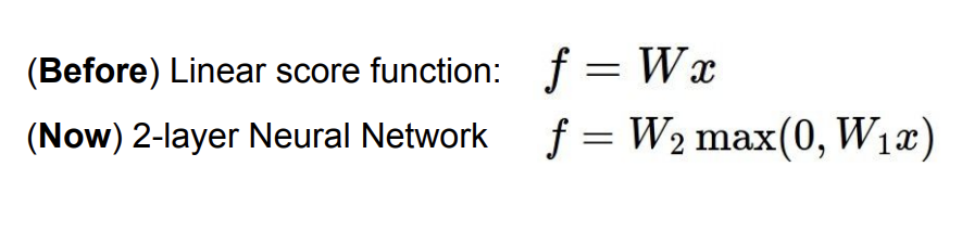 드디어 Neural Network 까지 왔다. Neural Network 를 구성하는 기본 요소는 Linear Classifier이다. 단지 Neural Network는 이를 여러 겹 쌓아서 만든 것이다. 더 정확하게 사물들을 분류할 수 있게 해주는 효과가 있다. 그러나, 각 layer 사이에는 non linear function이 껴 있어야 한다. linear하다면 output 또한 linear function이 나오므로, 더 복잡한 것을 분류하기 위한 우리의 취지와는 전혀 맞지 않기 때문이다.