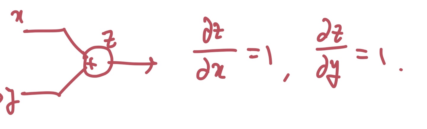 그림을 좀 못 그리긴 했지만, 어떤 문자로 z를 편미분하던 간에 local gradient는 1이 나온다. 이렇게 써놓고 보면 당연한 얘기다.