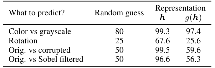 위와 같이, 각 representation을 가지고 추가적인 MLP를 훈련시켰을 때의 정확도는 h가 더 높은 것도 확인할 수 있다.