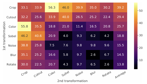 위의 그림은 실험 결과를 나타낸 그림이다. 써 있는 ImageNet top-1 accuracy를 나타내고, 대각선에 있는 원소들은 하나의 기법만 적용한 것이고, 나머지는 두 개의 기법을 사용해 실험한 것이다. 가장 정확도를 보인 방법은 56.3%의 random cropping-> color distortion이다. 또한, 대체로 하나의 방법만 사용해서는 좋은 결과를 얻기가 힘들고, 두 방법을 같이 사용했을 때 좋은 성능을 낸다는 것을 알 수 있다.