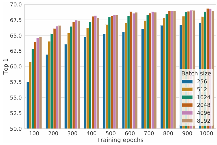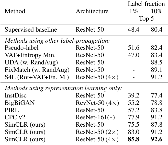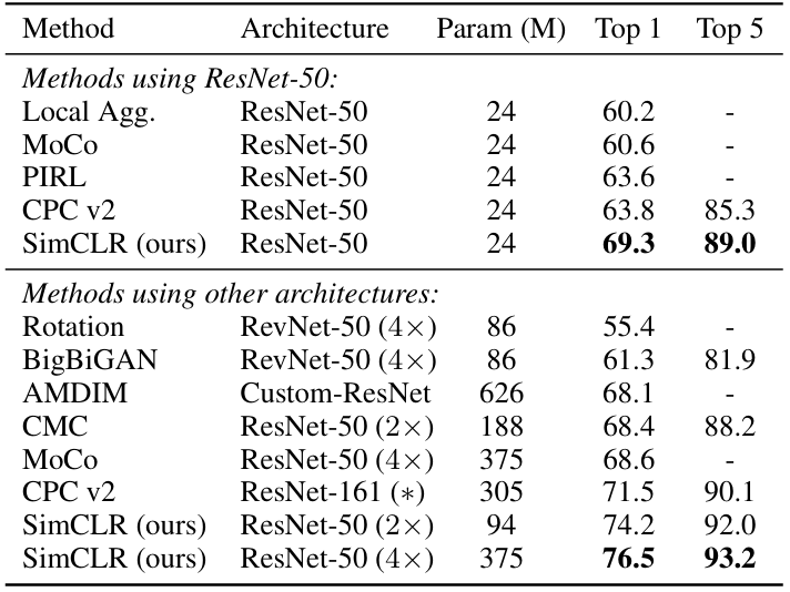 위의 그래프를 보면, epoch수가 적을 때는 batch size가 클수록 성능이 증가하며, epoch 수가 많아질수록 batch size에 따른 정확도 차이가 비교적 감소한다. supervised learning에서와는 다르게, 큰 batch size는 더 많은 negative sample을 제공하기 때문에 수렴을 하기 쉽게 만들어준다. 마찬가지의 논리로 훈련을 오래 할수록 더 좋은 성능을 얻는다. 이러한 구조를 바탕으로 SimCLR은 이전 SOTA보다 더 좋은 성능을 낸다.