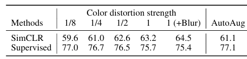 또 하나 눈여겨 볼 만한 포인트는 color distortion의 강도이다. contrastive learning은 supervised learning 보다 augmentation의 강도를 크게 했을 때의 효과가 훨씬 크다. 아래의 표로 그 결과를 확인해 볼 수 있다.