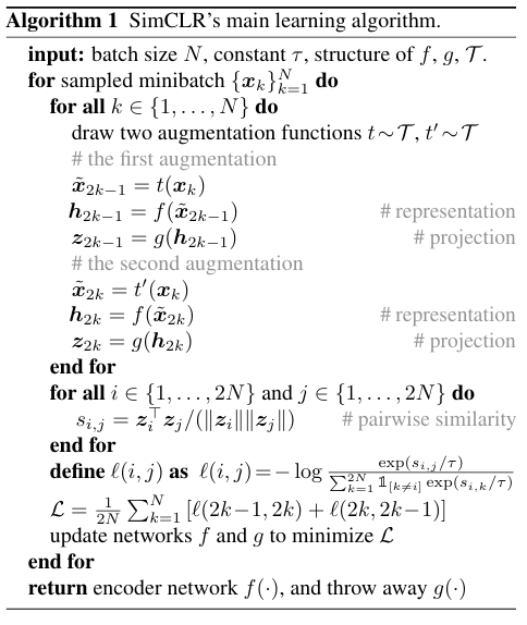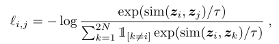 contrastive loss는 contrastive prediction task를 위해 정의되었다. 이 loss의 목표는 가 주어졌을 때, 를 identify하는 것이다. 일단 mini batch를 sample하고, 위에서 언급한 것과 같이 data augmentation된 와 를 얻는다. 만약 batch size가 이라면, augmentation이 끝나고 난 후의 sample 개수는 2N개가 될 것이다. 이러한 방식을 바탕으로 아래의 positive pair 에 대한 loss function이 정의된다.