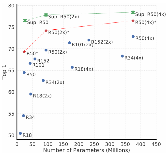 위의 그래프를 보면, 모델의 depth와 width를 늘리는 것은 성능 개선에 긍정적인 영향을 준다. 특히, 주목해야 할 것은 unsupervised 모델의 크기가 커질수록 supervised model과의 gap이 줄어든다는 것이다. 이는 unsupervised learning이 크기가 큰 모델에서 supervised learning보다 더 많은 이득을 본다고 해석할 수 있다.