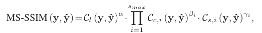 실전에서 SR 모델들은 각기 다른 scale에서 resolution enhancing을 진행하는데, 이를 MS(Multi-Scaling)이라고 한다. 이에 따라 기존의 metric을 바꿔줘야 한다. MS-SSIM index는 SSIM에 MS를 적용한 metric이다. 의 scaling 범위를 가지는데, 이미지를 부터 2로 계속 나눠주면서 downsampling을 한다. 이렇게 다양한 scale에서 enhancing을 진행하는 것이다. 각 scale에 대해 comparison을 계산하기 때문에 MS-SSIM은 아래의 식과 같이 표현할 수 있다.