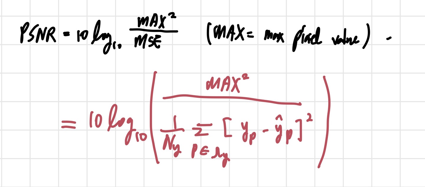 영상처리에서 많이 쓰이는 objective assessing method이다. subjective IQA의 단점과 더불어 task에서 사용하는 dataset의 크기가 크기 때문에 objective한 평가 방법도 중요하다. PSNR은 객관적 평가 방법으로 유명한 방법 중 하나이며, MSE와 MAX pixel value간의 비율을 가지고 quality를 측정한다. 식은 아래의 사진과 같다.
