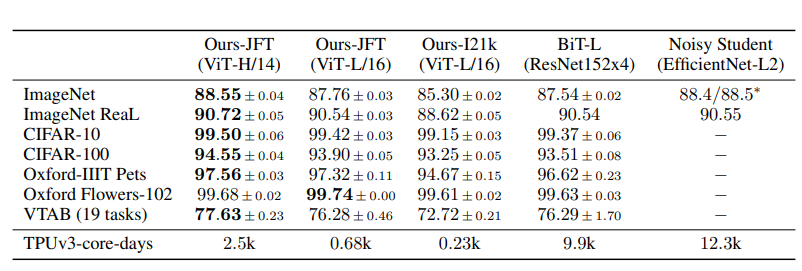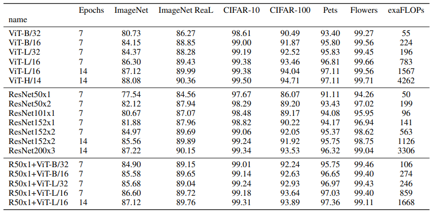 저자는 ResNet, ViT, hybrid(ResNet+ViT)의 학습 능력을 평가하는 실험을 진행한다. pre-training에 사용한 dataset은 ILSVRC-2012 ImageNet, ImageNet-21k, JFT이다. 그리고 나서 더 작은 dataset인 ImageNet, ReaL Labels, CIFAR-10/100, Oxford-IIIT Pets, Oxford Flowers-102, VTAB에 fine tuning을 진행한다.