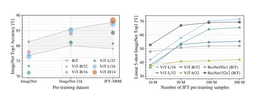 이렇게 ViT의 성능이 이전 SOTA보다 전반적으로 우수하다는 사실을 확인했다. 위의 표에서 성능이 가장 우수한 모델은 크기가 가장 큰 dataset(300M 크기를 가짐.)인 JFT에 pre-train한 모델이다. ViT가 크기가 큰 dataset에서 좋은 성능을 발휘하는 것을 관찰하고, 저자는 dataset의 크기가 성능에 얼마나 영향을 미치는지 알아보는 두 가지 실험도 진행했다. 첫 번째 실험에서는 ViT 모델들을 pre-training할 때 사용하는 dataset의 크기를 점점 늘려가는 실험이었고, 두 번째 실험은 JFT에서 subset을 9M,30M,90M,300M(원래의 JFT) 크기로 뽑아 훈련시키고 성능을 비교한다.