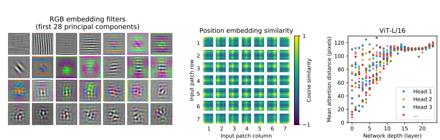 마지막으로 ViT 내부에서는 어떤 일이 일어나고 있는지에 대한 내용이다. 왼쪽 사진은 ViT의 첫 번째 layer의 linear embedding filter들을 시각화한 것이다. CNN의 초반 layer를 시각화한 것과 같이 low level feature들을 잘 잡고 있는 것 같이 보인다. 가운데 사진은 position embedding silmilarity에 기반해서 모델이 distance를 encode하는 방법을 학습한다는 것을 보여준다. 저자는 ViT에 self-supervision pre-training을 적용해 어느 정도 성과를 내기도 했지만, 여전히 supervised pre-training보다 4% 낮은 accuracy이다. 앞으로 더 연구되어야 할 주제이다.