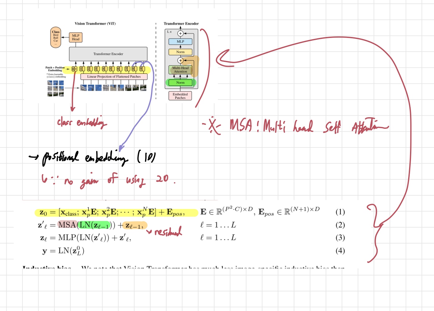 위의 사진은 논문의 식들이 구조도에서 어떤 부분을 나타내는지 표현한 사진이다. 내가 직접 그려 그렇게 깔끔하진 않지만 이해에 도움이 되긴 했다. 는 이미지 data 에 patch embedding과 positional embedding을 나타낸 식이다. 앞서 언급했던 것처럼 class token이 맨 앞에 추가된 것을 볼 수 있다. 각 patch 에 를 곱해 (N,D) 크기로 차원을 맞춰는 것도 확인할 수 있다. 그 이후에는 일반적인 transformer encoder와 같이 MSA-> MLP를 거치게 된다. 이것이 ViT가 데이터를 처리하는 기본적인 방법이다. 다음으로, ViT가 가지는 특성들에 대해 살펴보자.