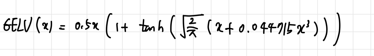 GELU는 이름에서부터 ReLU와 비슷한 느낌이다. 실제로, ReLU를 대체할 수 있는 activation function으로 사용된다. ViT 모델에서 MLP의 non-linearity로 ReLU 대신 GELU가 사용된다. 구체적인 식은 아래와 같다.