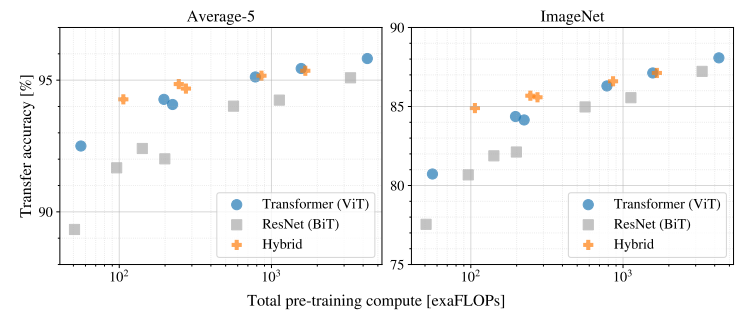 Scaling Study는 parameter가 변함에 따라 모델의 성능이 어떻게 변하는지 살펴보는 파트이다. 저자는 performance와 pre-training cost간의 관계에 대해 탐구하는 것에 집중한다. 두 개념은 trade-off 관계를 가진다. 성능이 높아지려면 어느 정도 pre-training cost는 감수해야 한다는 뜻이다. 실험에서는 여러 모델들을 JFT-300M에 훈련시킨 후 downstream task에서의 transfer performance를 비교한다.