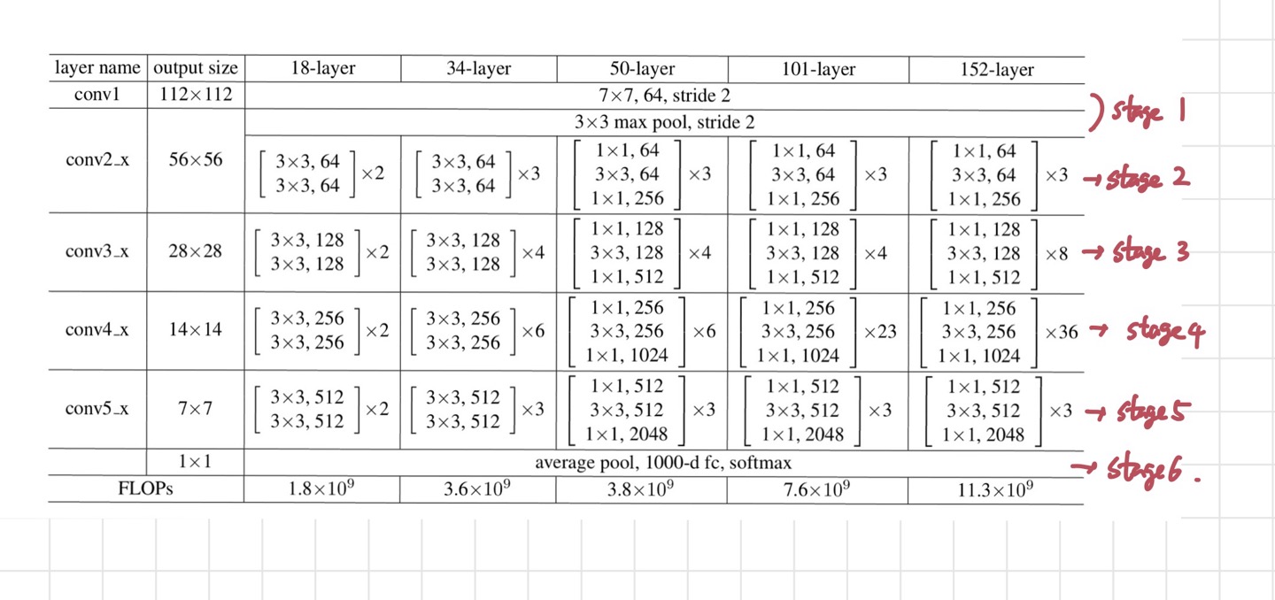 방법 ii)가 4배 더 긴 sequence를 가지고 있으며 계산량도 더 많다. 여기서 언급되는 ResNet stage는 아래 표에서 보다시피 layer의 특정 부분들을 뜻하는 표현이다.