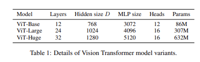 기본적으로 논문에 등장하는 ViT 모델은 BERT의 Base와 Large 모델을 따르며, 여기에 저자는 Huge 모델을 추가해서 사용한다. 논문에서 사용하는 ViT-L/16과 같은 식의 notation은 해당 모델이 ViT-L이고, input patch size=이라는 뜻을 담고 있다. 이때 (patch size의 제곱)= computation 양에 반비례한다. 따라서 patch size가 작으면, 계산량이 많아지는 것이다. 이는 직관적으로 생각해도 이해할 수 있다.