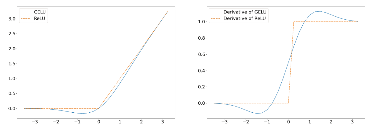 위의 그래프를 보면, GELU의 gradient 변화가 ReLU보다 훨씬 부드러운 것을 볼 수 있다. 그렇기 때문에 vanishing gradient problem을 ReLU보다 더 잘 해결할 수 있고, 모든 input value에 대해 부드러운 형태를 가지고 있기 때문에 효과적으로 데이터를 다룰 수 있다.