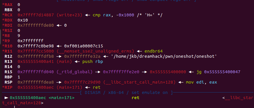 우리는 ret에 원가젯을 넣을 것이기 때문에 이 시점에 rax == NULL임을 알 수 있다.