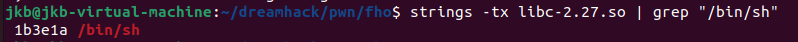 strings -tx libc-2.27.so | grep "/bin/sh"