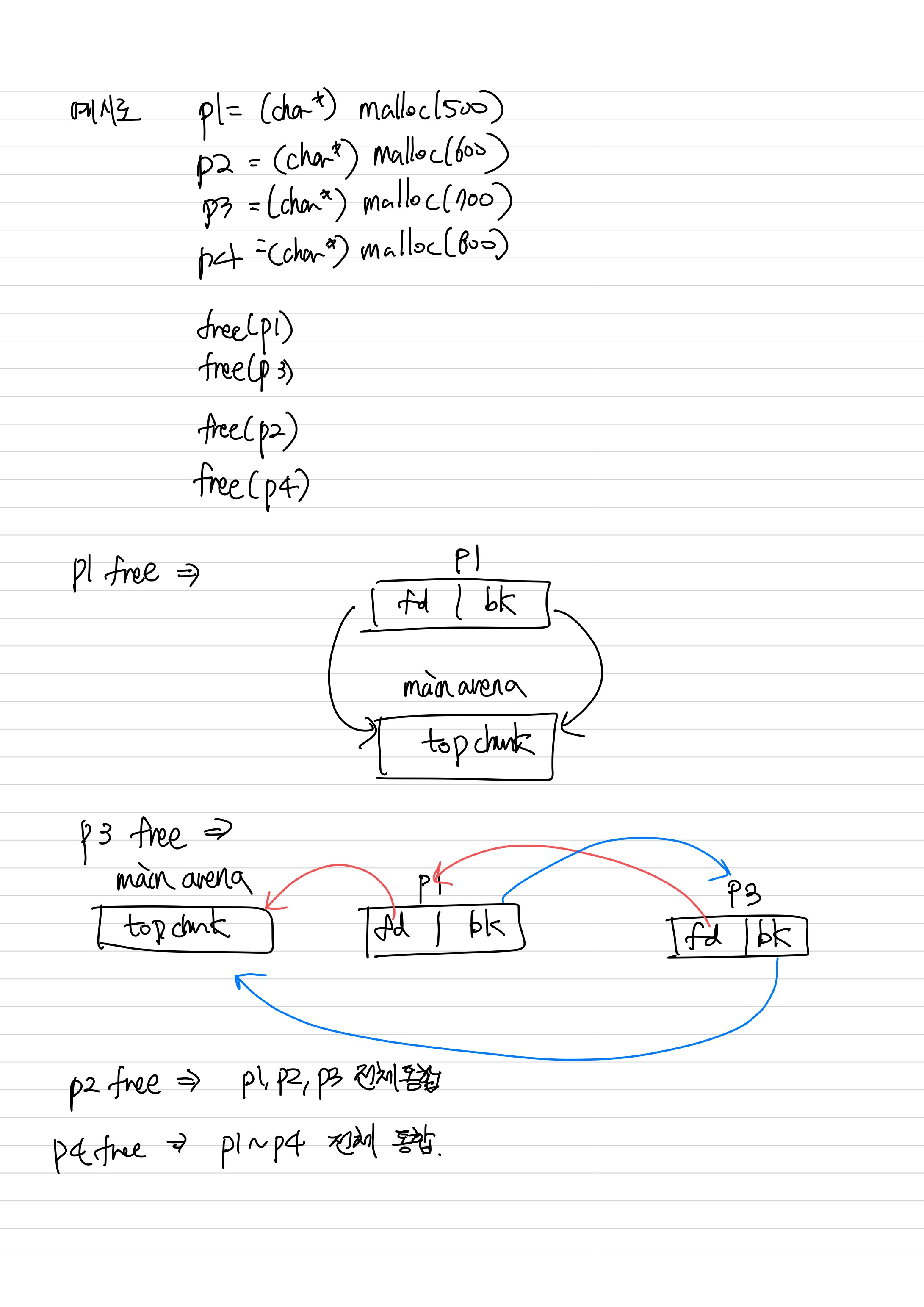 할당된 청크와 해제된 청크가 중첩되면 fd와 bk를 조작할 수 있게 되고, 이는 ptmalloc2의 free list에 임의 주소를 추가할 수 있음을 뜻한다.