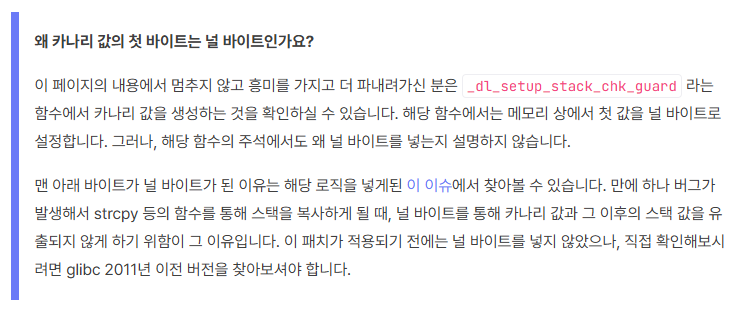 참고: 카나리 시작값은 널 바이트. 카나리 값 유출 방지