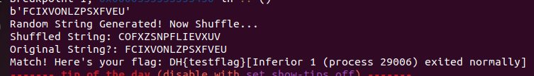 셔플된 문자열을 출력해주고 원래 문자열과 입력받은 문자열을 비교한 후 플래그를 출력해준다.