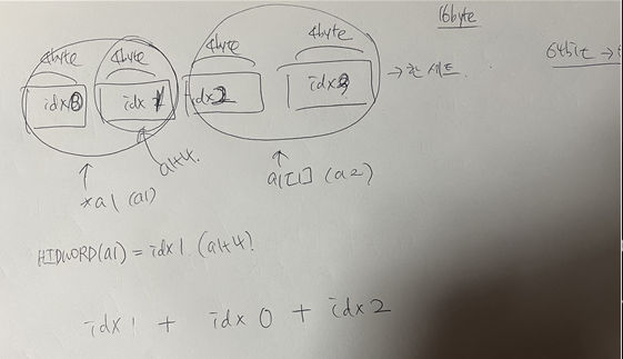 base에 각각의 값을 넣고 sort는 64bit 기준으로 하길래 64bit로 저장하고 연산을 더 해야 하는 줄 알았다. 그런데 어셈블리로 살펴보니 이상하게 다 eax였다. 메모리를 그리고 인덱스를 정리해보니 결국에는 base[4*i], base[4*i+1], base[4*i+2]에 대한 벡터를 만들면 끝이었다.