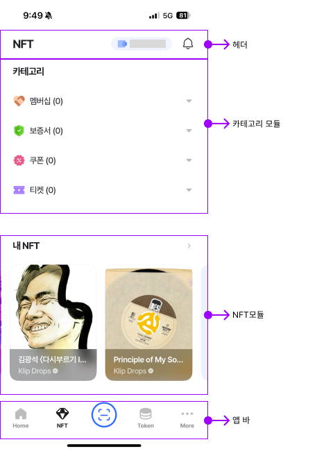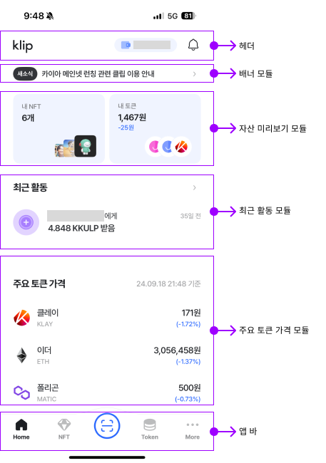 - 클립 로고와 내 지갑주소, 알림 등을 확인할 수 있다.