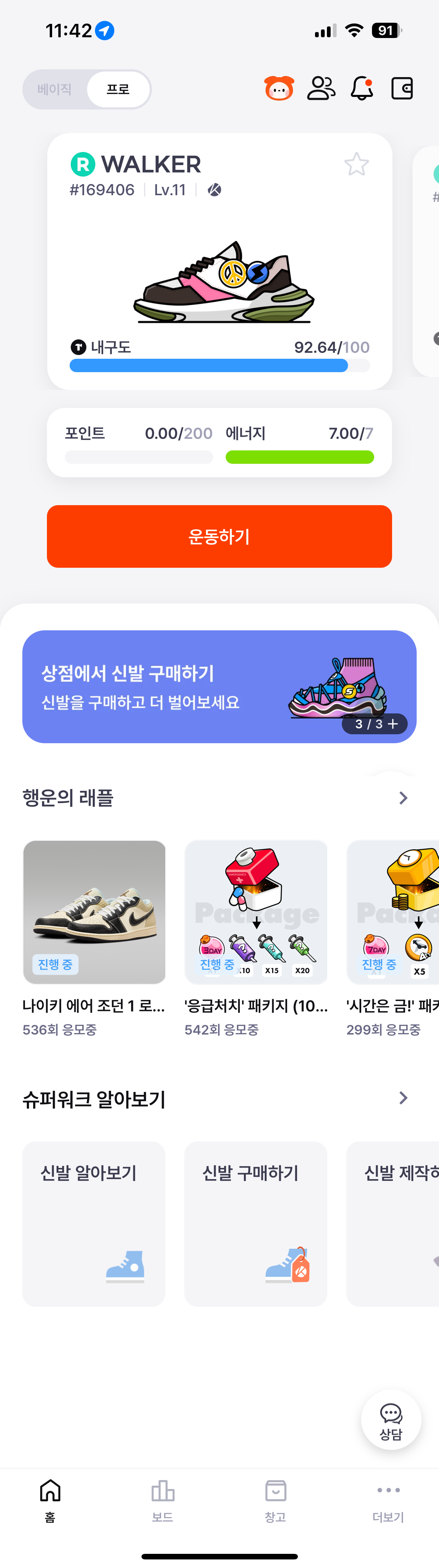 - 슈퍼워크는 무료로 Move-To-Earn을 이용할 수 있는 베이직 모드와 신발 NFT를 구매해 Move-To-Earn을 이용할 수 있는 프로 모드들 토글키로 간편하게 변경할 수 있다.