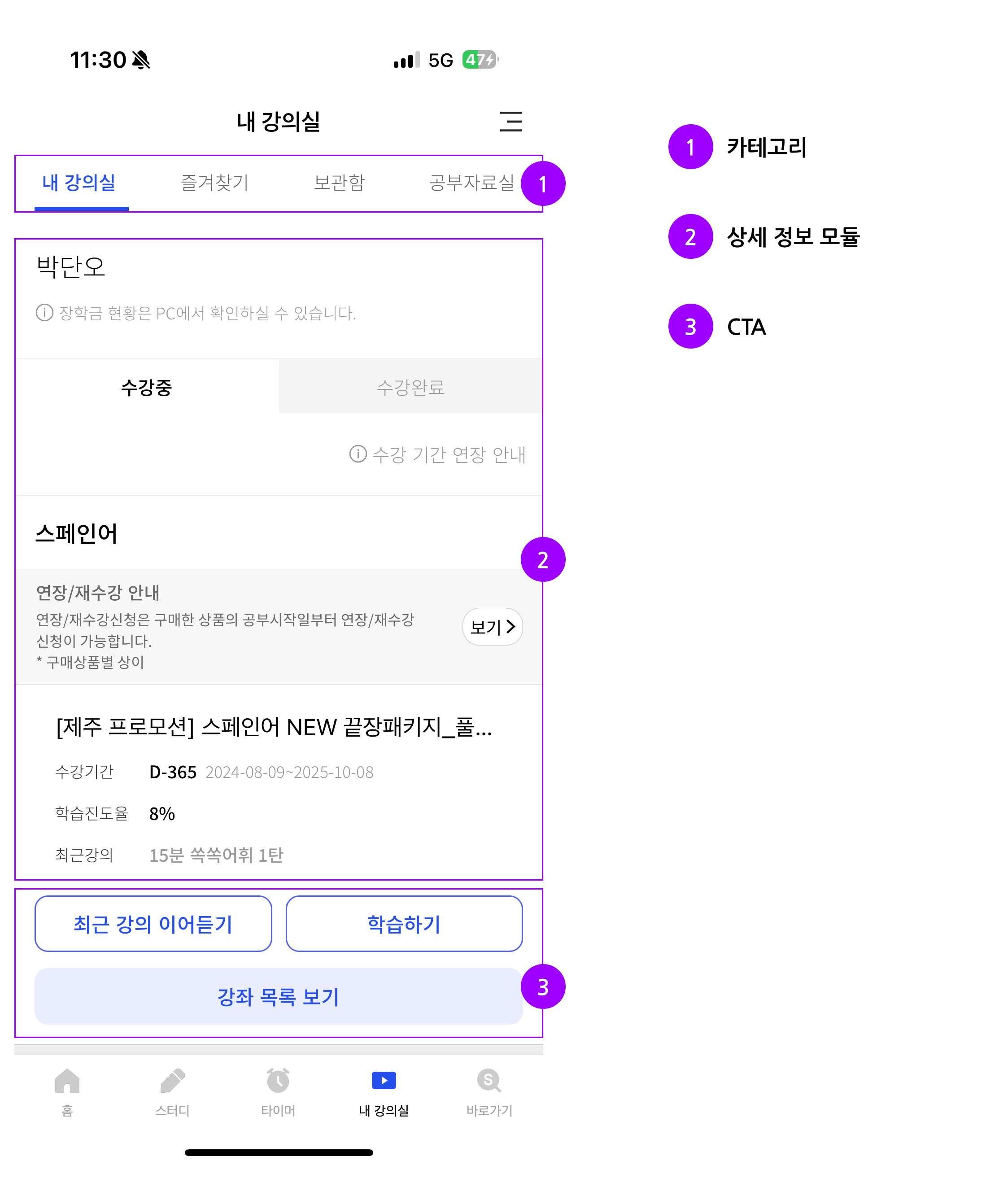 - 학습중인 강의를 바로 학습할 수 있도록 상단에 배치
