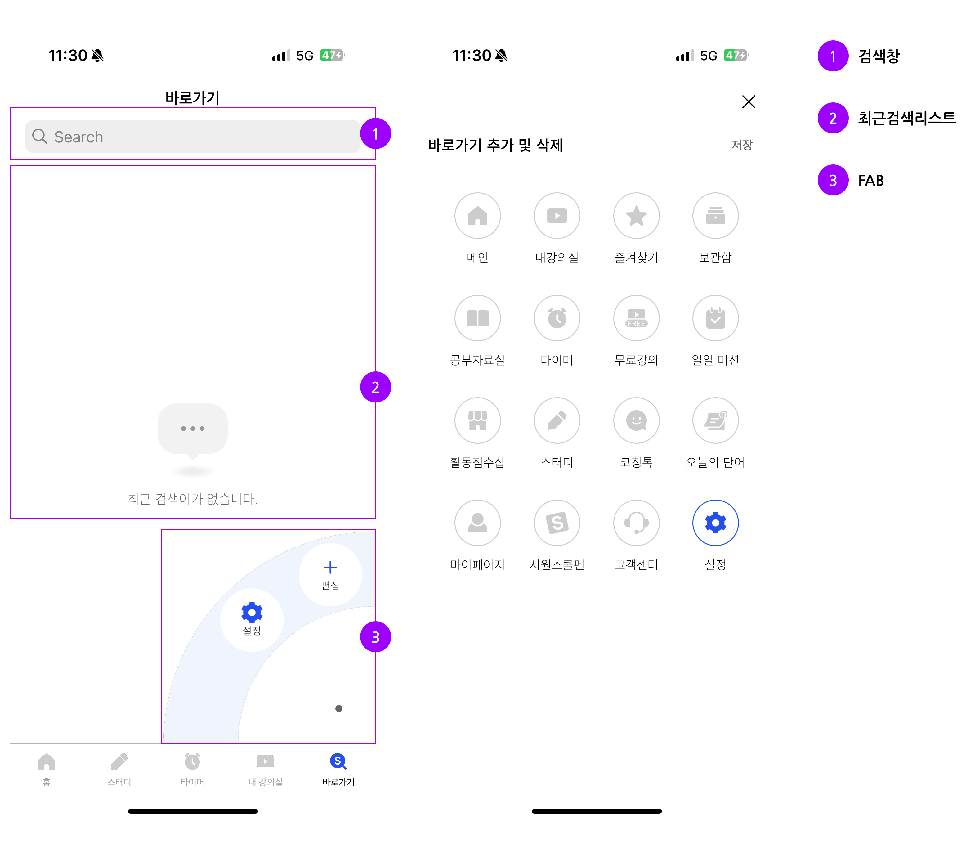 - 앱 바에서 바로가기 탭 > 검색 또는 FAB 버튼에서 찾거나 없을 경우 편집을 통해 새로 추가하여야 함