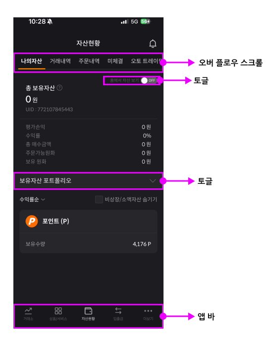 - 토글 기능을 통해 내 자산을 숨기거나 보여지게 할 수 있다.