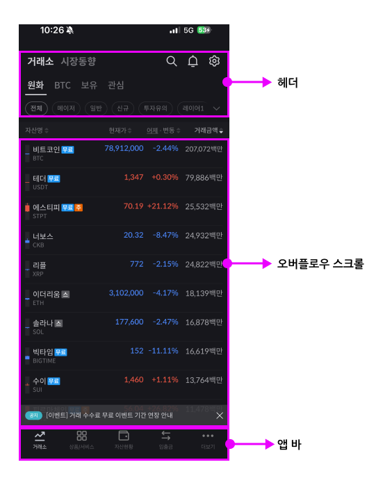 - 상장된 가상자산들을 오버플로우 스크롤로 볼 수 있다.