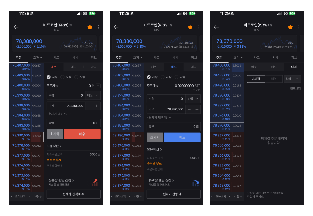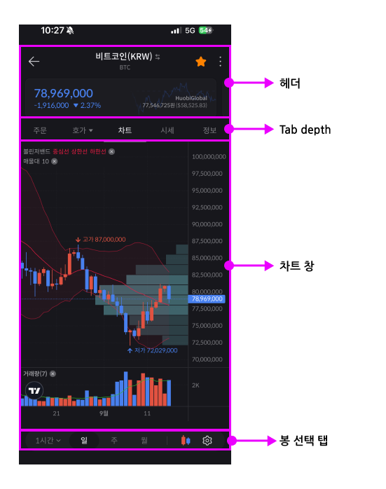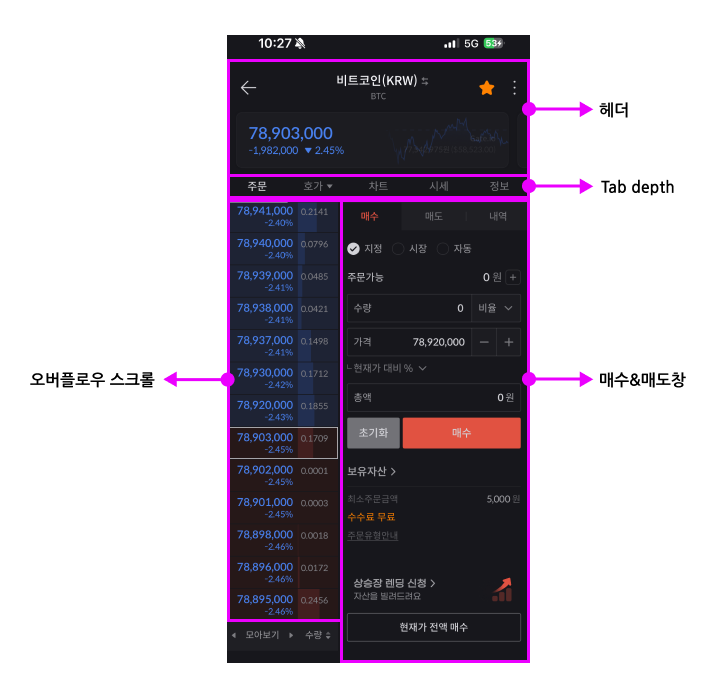 - 가상자산 주문, 차트, 시세, 정보 등을 탭 기능을 통해 신속하게 볼 수 있다.