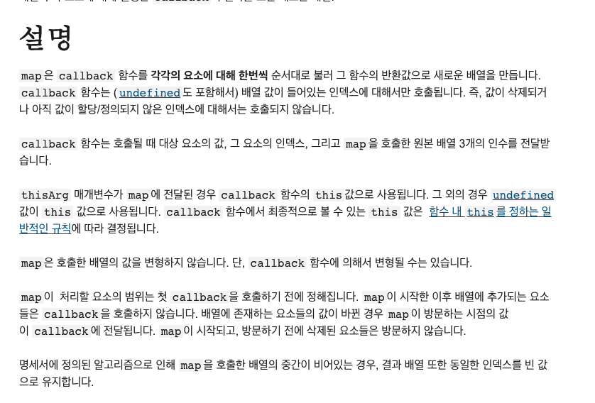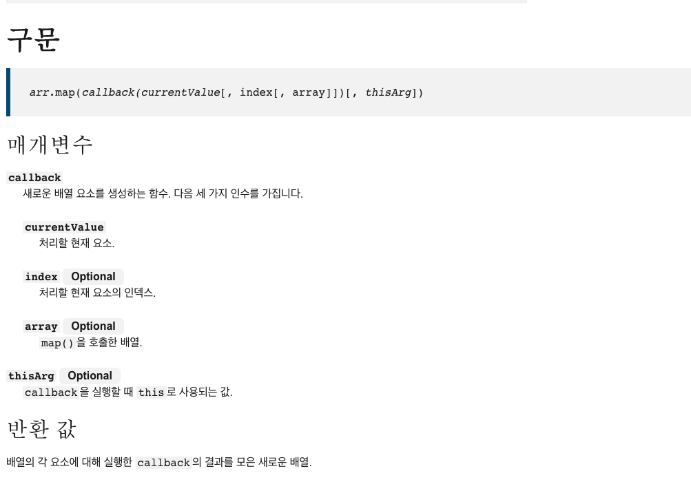 각각 요소를 한번식 순서대로 들어가 반환값으로 새로운 배열을 만단다, 이 기능이 유용한 이유는 manipulation(조작하지않는다는것)이다.