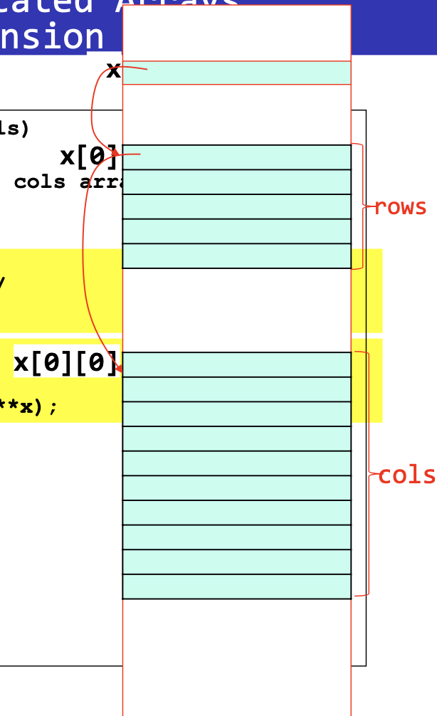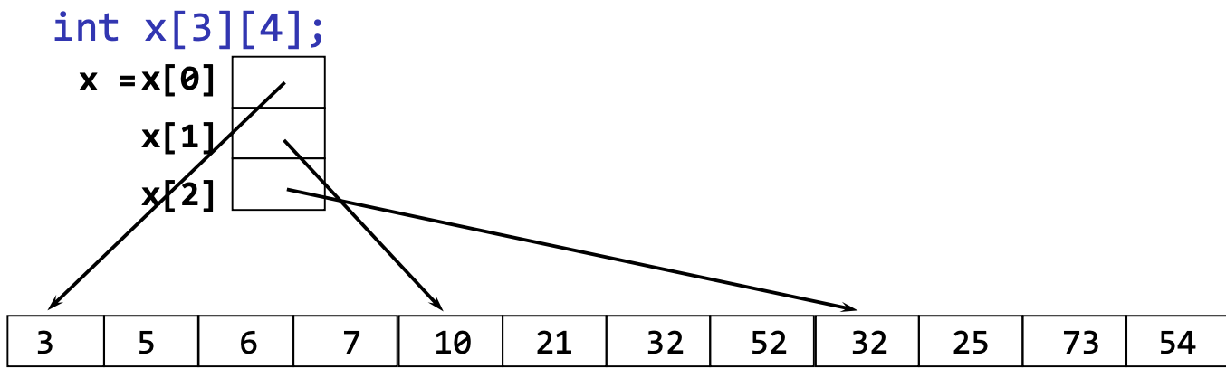첫 번째 array는 실제 int 값을 가지고 있는게 아니라 int 값을 가지고 있는 1d array들의 첫 번째 주소를 가지고 있는 array로 구성되어있음