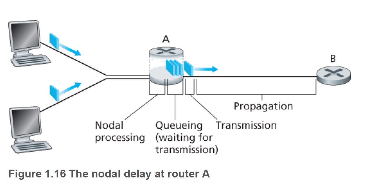 Total nodal delay: 패킷이 source에서 라우터와 스위치를 거쳐 목적지 end system에 도달하기까지 많은 딜레이들이 발생한다. 이 모든 것을 합쳐서 total nodal delay라고 함. (nodal processing delay, queueing delay, transmission delay, propagation delay)